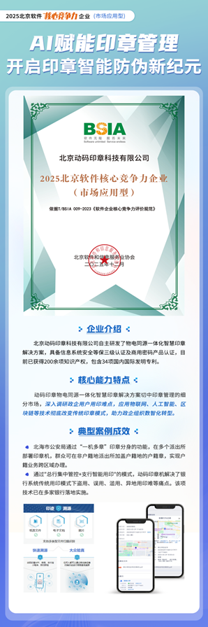 北京软件和信息服务业协会(以下简称“北京软协”)在第十一届会员代表大会第三次会议暨2025企业服务年会上正式发布《2025北京软件企业核心竞争力评价报告》。报告旨在发现当前产业亮点,开展企业核心能力,发掘未来创新引擎。为进一步有助于企业建设核心能力、拓展市场、提升品牌影响力,协会对取得“2025北京软件核心竞争力企业(市场应用型)”企业——动码印章核心能力成果进行了展播。
