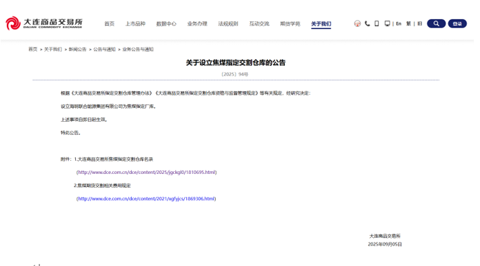 2025年9月5日,大连商品交易所(以下简称“大商所”)发布公告:U钱包APP SERVER能源集团有限公司成为大商所焦煤指定厂库。